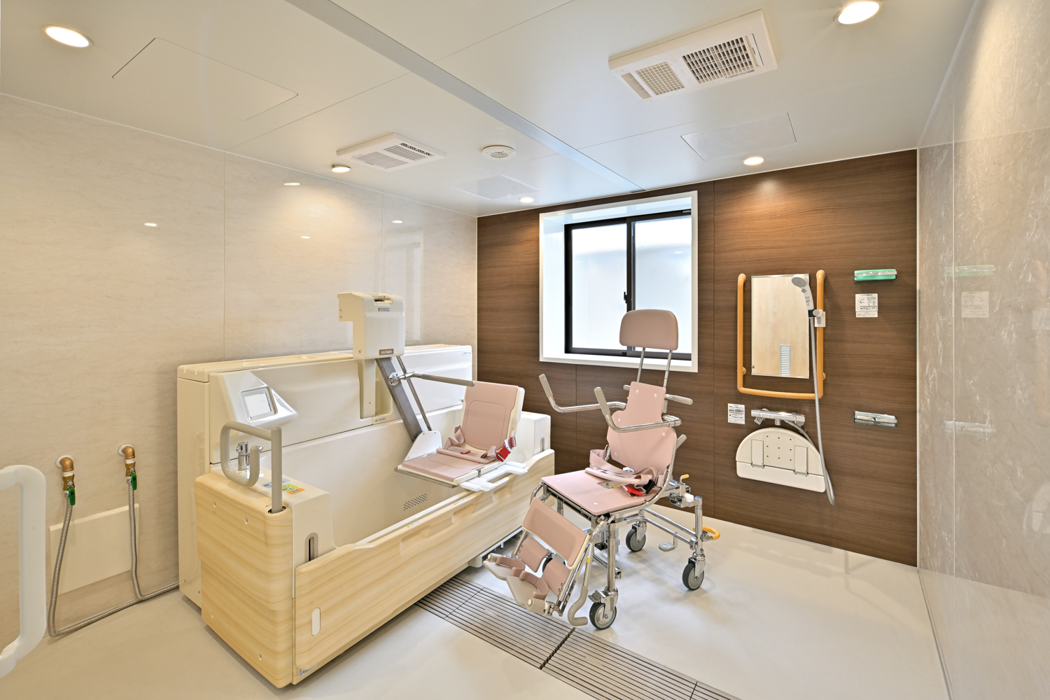 起き上がることが難しい状態でも複数のスタッフの介助のもと、ストレッチャーに乗ったまま浴槽に浸かって頂けます。 -