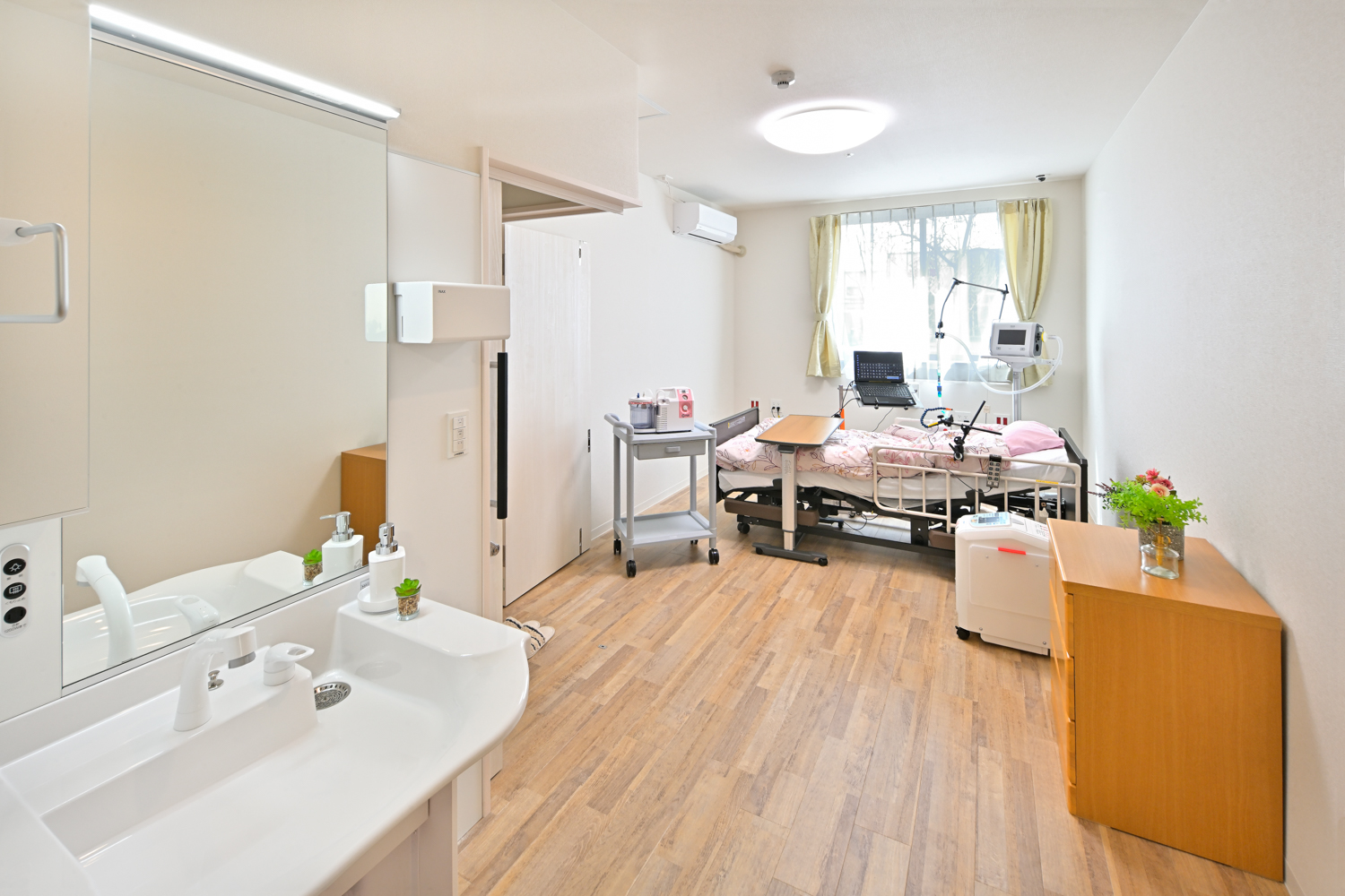 | 居室備え付け | 3モーター電機介護ベッド、車椅子対応トイレ、サイドテーブル、車椅子対応洗面台、エアコン、カーテン、照明、チェスト、緊急通報装置 |